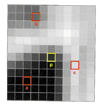 예를 들어, p 라는 특징점 주위에 a, b, c 라는 미리 정의된 픽셀이 있고,