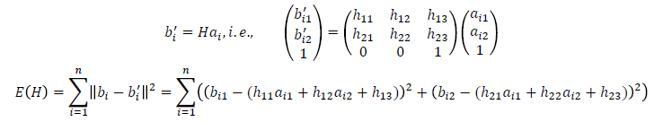 다음과 같이 H homography를 사용함에 따른 bi, b'i 사이의 최소제곱법 결과를 E(H)라고 하자.