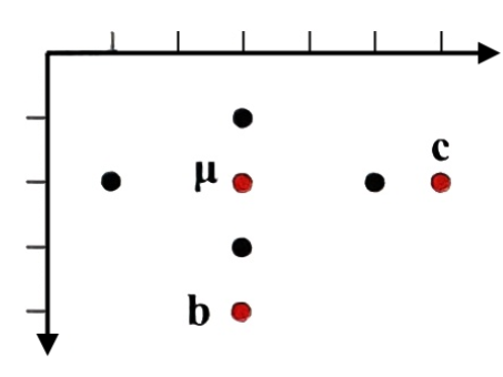 만약 유클라드 거리를 구한다면, μ-b 사이의 거리는 2, μ-c 사이의 거리는 3 이다.