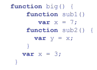위 코드로 볼 때, static scoping 방식을 사용하면 sub2 에서 참조하는 x는 big의 x다.
