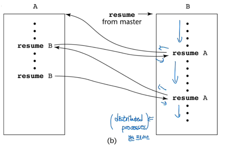 이때, A, B가 정말 동시에 진행되면 이를 distributed process 라고 한다. (분산 프로세스)