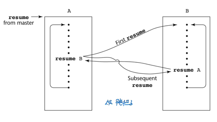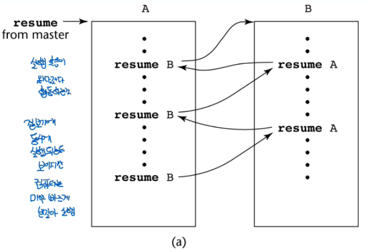 마지막으로 코루틴은 여러 entry를 가진 서브프로그램을 말했다.