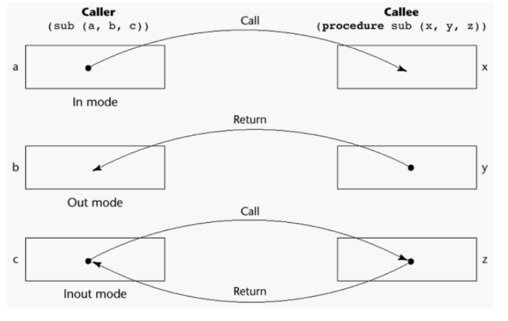 in mode, 즉, 서브프로그램에 값을 전달하기만 한다. Call-By-Value 라고도 한다.