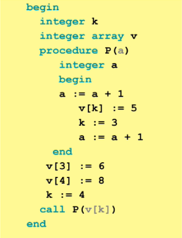 이 프로시저에 대해, call by value, call by name, call by reference로 호출 했을 때 실행 결과를 정리해보자.