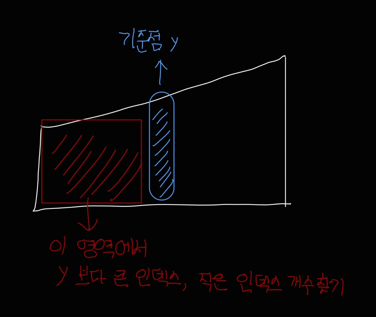 파란색으로 표시한 점이 기준점이라고 하면, 빨간색 부분이 정답을 찾을 후보지다.