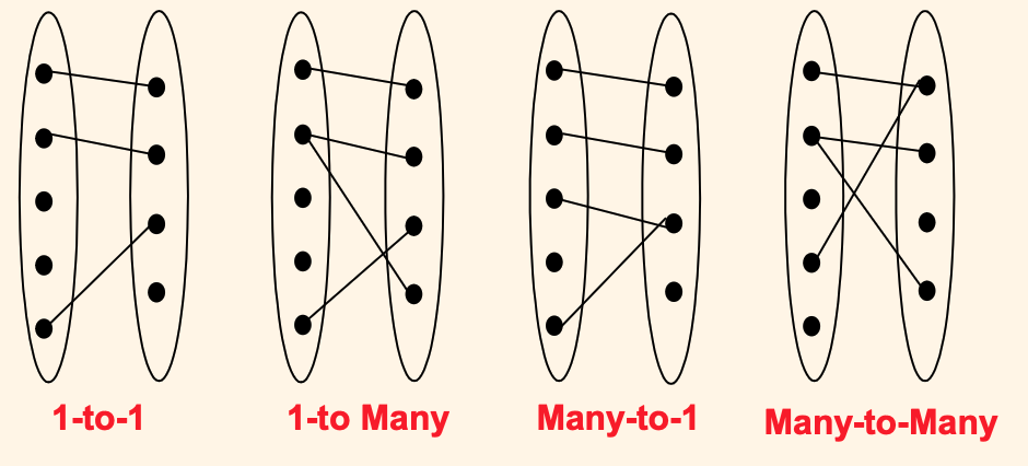 두 엔티티 사이의 관계는 키 제약조건을 어떻게 거는지에 따라 위와 같이 4가지 종류의 관계가 형성될 수 있다.