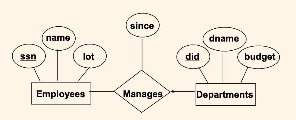 다이어그램을 보면 모든 Departments 는 Manages 관계에 참여하고 있으므로, 모든 부서에는 관리자가 존재해야 한다.