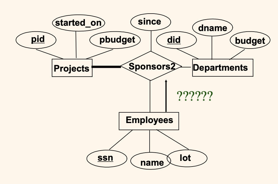 지금과 같은 상황에서는 직원에게 걸린 키 제약조건이 Project 에 걸리는 것인지, Departments에 걸리는 것인지 모호하기 때문에 aggregation 으로 표현하는 것이 더 좋다.