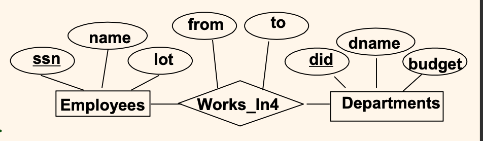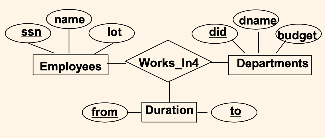 이때 Works_In4 관계는 이 직원이 언제부터 언제까지 일했는지 일한 기간도 속성으로 갖고 있다.