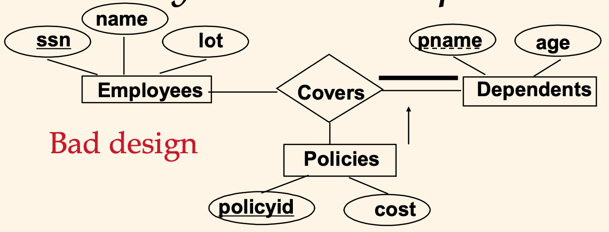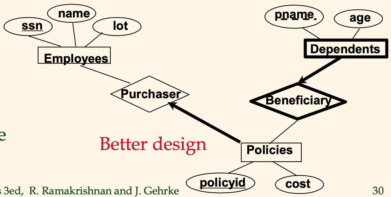 왜냐하면 화살표를 긋는 순간, (employee, dependents, policy) 관계에 대해서 policy 가 한번만 참여한다는 뜻이 되므로,
