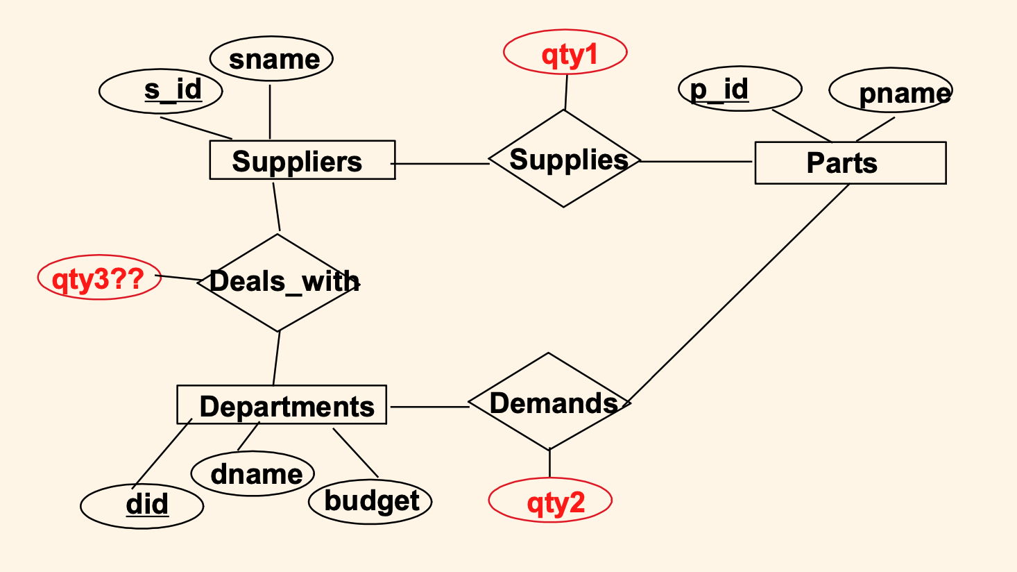 이렇게 공급사, 부품, 부서 사이에 이진관계를 3개 구성하고, 각 관계에 qty를 두는 경우에는 당연하지만 '계약 수량' 이라는 의미가 분산되게 된다.