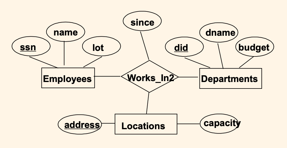 그림과 같은 ERD가 있을 때, Works_In 관계 집합은 다음과 같은 테이블로 만들어질 수 있다.