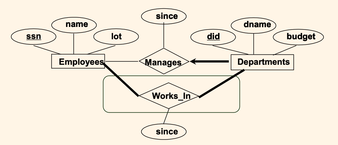 참여 제약조건을 명시하려면 기존의 Manages 관계집합을 테이블을 만드는 방법으로는 명시할 수 없다.