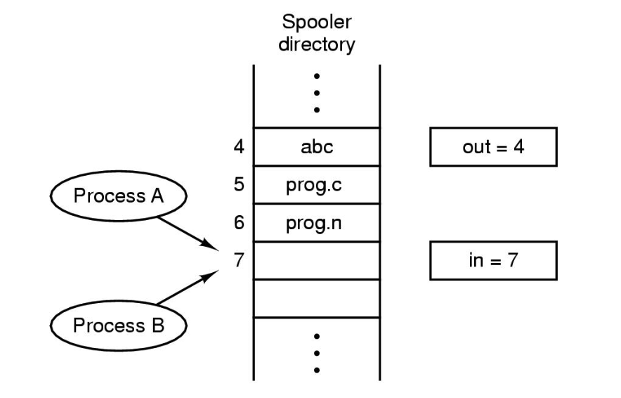 만약 프로세스 A, B 가 모두 스풀러 디렉토리에 접근해서 파일을 추가하기를 원한다고 해보자.