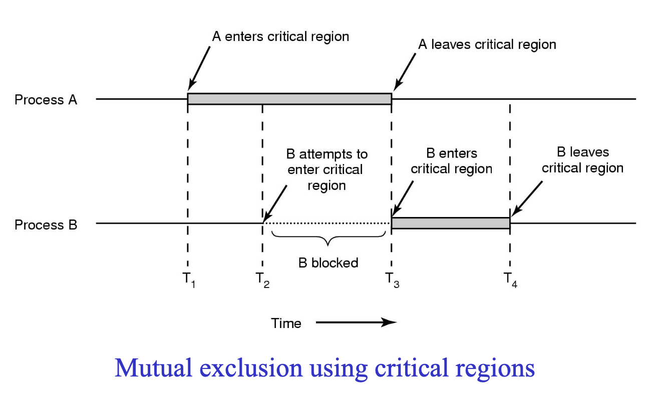 T3 시점에 프로세스 A 가 임계구역을 떠나면 그 때 프로세스 B가 임계구역에 들어올 수 있게 된다.