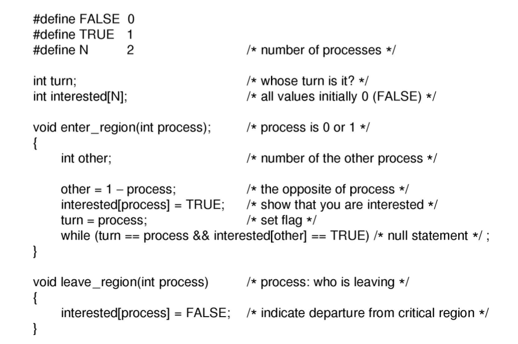 다른 프로세스가 만약 임계 영역 코드 실행을 끝내면 그때는 leave_region() 메서드를 호출하는데, 이 메서드는 단순히 intersted 배열에서 해당 프로세스의 값을 False 로 설정한다. 그러면 기존에 대기하던 프로세스는 interested[other] 이 False 가 되므로 반복문을 탈출하면서 함수가 종료되고 임계 영역에 들어갈 수 있게 된다.