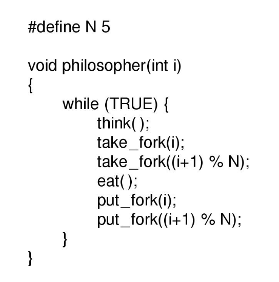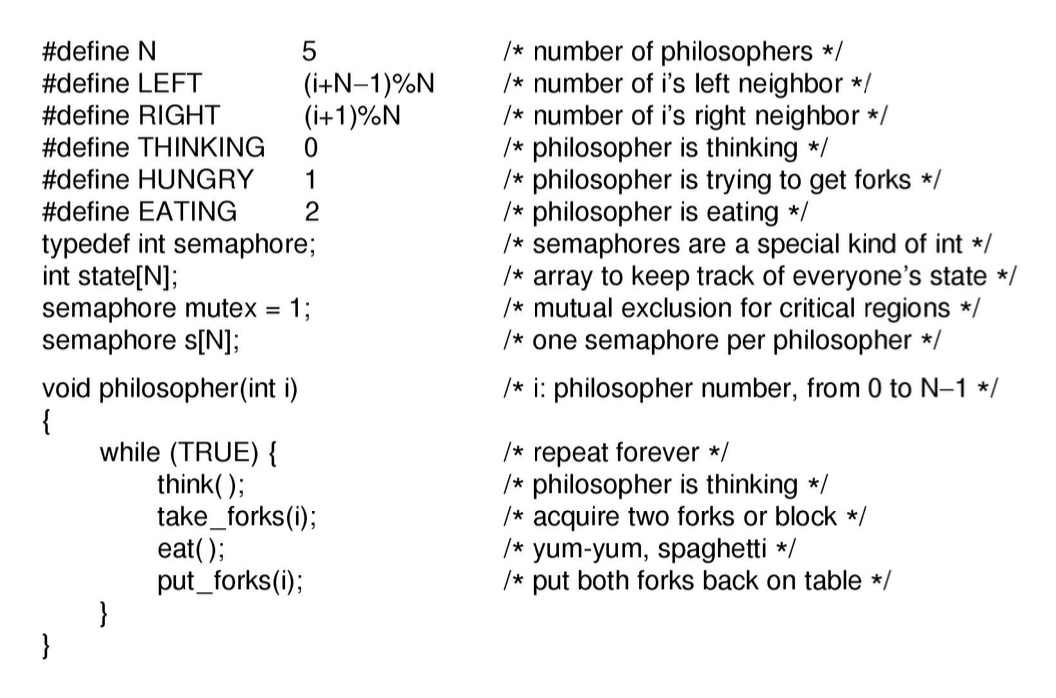 각 철학자 프로세스는 i 라는 번호를 가지며, 생각하고, 두 포크를 집고, 먹고, 포크를 내려놓는다.