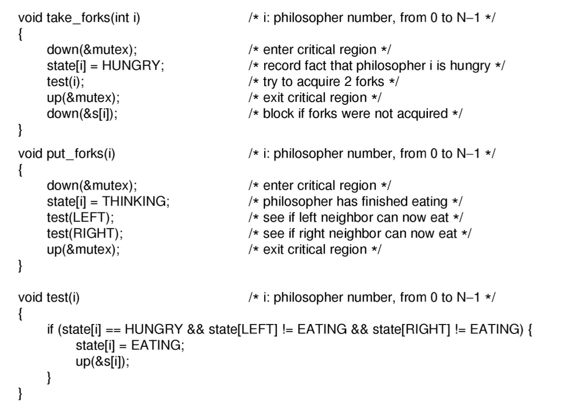 (만약 2번과 4번 프로세스가 동시에 식사를 하고 있었고, 2번 프로세스의 put forks() 이후 4번 프로세스의 put forks() 가 호출되면 3번 프로세스의 s[3] 은 2가 되지 않을까 생각했었지만, 이 문제에서 세마포는 '바이너리 세마포' 로서 0 아니면 1의 값만 가질 수 있으므로 2가 되진 않는다.)
