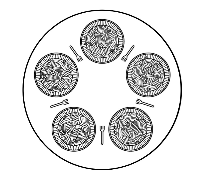 이때 만약 모든 철학자가 동시에 식사를 시작하면 모두 동시에 왼쪽 포크를 집어들고 오른쪽 포크를 서로가 영원히 기다리므로 식사를 할 수 없게 된다. 이렇게 서로가 이미 점유한 자원에 서로 의존하여 모든 프로세스가 동작을 멈추는 상황을 '데드락(교착 상태)' 이라고 한다.