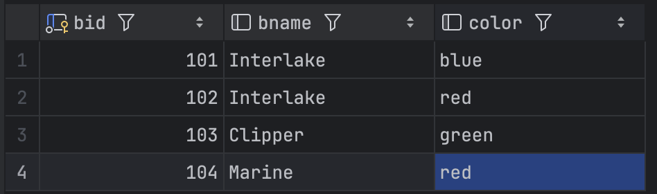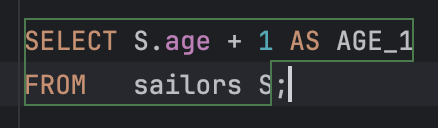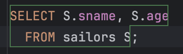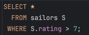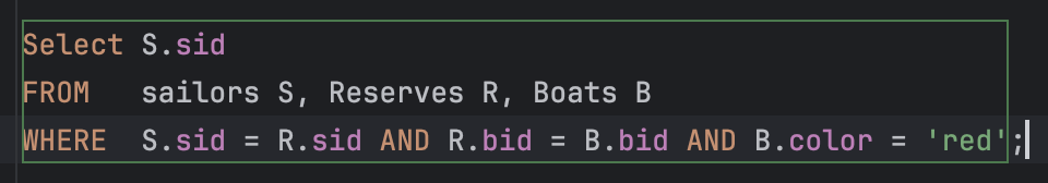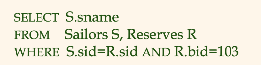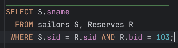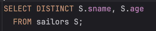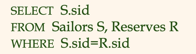 (책에는 DISTINCT 를 사용하지 않았으며, sid 정보는 사실 Reserve 테이블에 들어있기 때문에 굳이 Sailors 테이블을 가져올 필요는 없었다.)