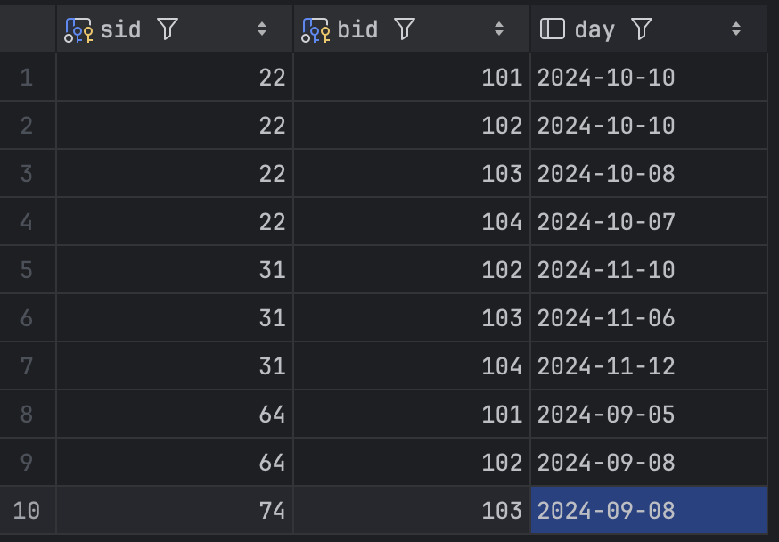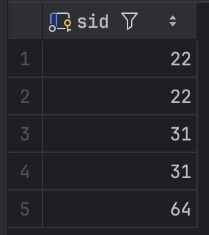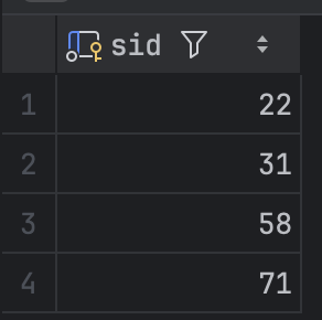 이때 이렇게 하면 여러 sid 가 중복으로 나오므로, DISTINCT 키워드를 사용해서 중복된 sid 를 없애줄 수 있다.