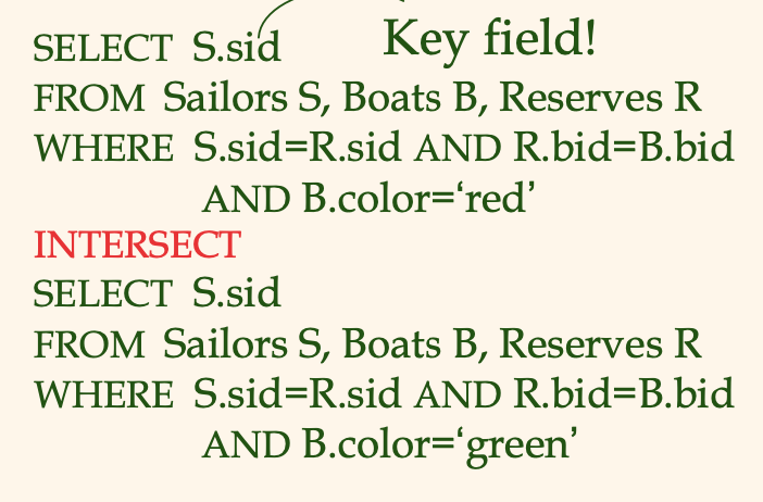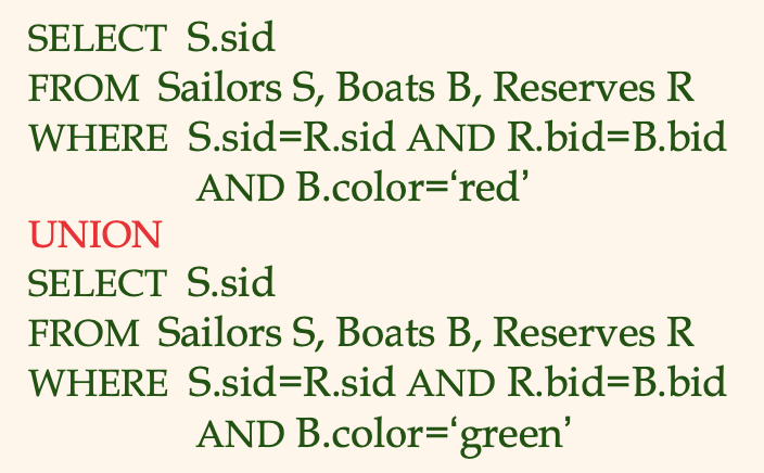 SQL 연산의 결과는 결국 행들의 집합이므로, 스키마가 같다면 (union-compatible) 두 SQL 결과는 합집합, 교집합, 차집합의 대상이 될 수 있다.