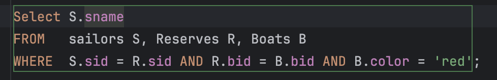 WHERE R.bid = B.bid AND B.color = 'green')