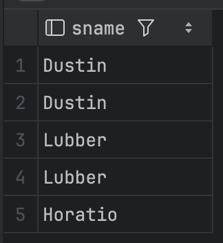 하지만 만약 S.sid 대신 S.sname을 사용하면 이때는 DISTINCT 키워드를 사용해서 중복을 제거할 수 없다.