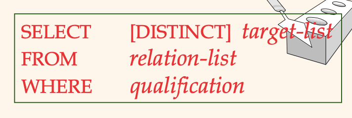 SELECT 절은 target-list 로 relation의 어트리뷰트를 지정한다. 관계 대수와 다르게, 중복 데이터를 제거할 때는 DISTINCT 키워드를 사용해야 한다.