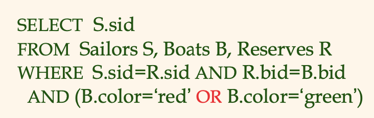 WHERE R.bid = B.bid AND B.color = 'red')