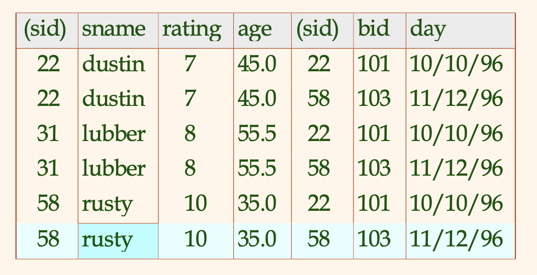 (책에는 DISTINCT 를 사용하지 않았으며, sid 정보는 사실 Reserve 테이블에 들어있기 때문에 굳이 Sailors 테이블을 가져올 필요는 없었다.)