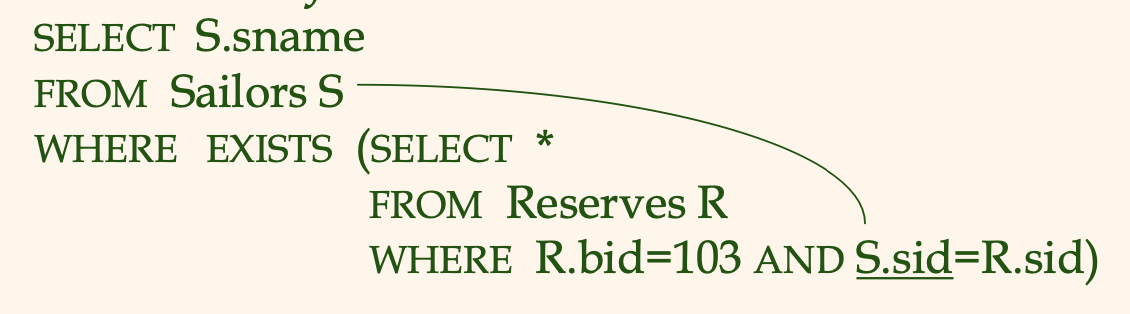 각 Sailors 의 튜플에 대해 서브 쿼리가 반복적으로 실행되면서 그 조건이 TRUE 가나오는 튜플만을 선별한다.