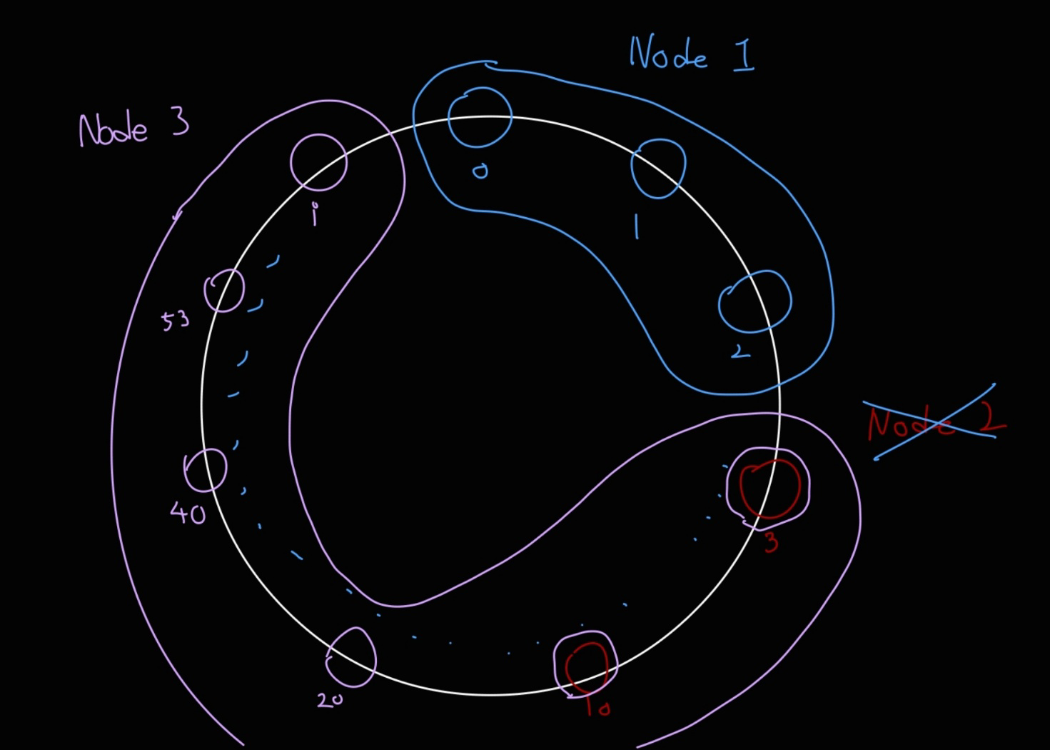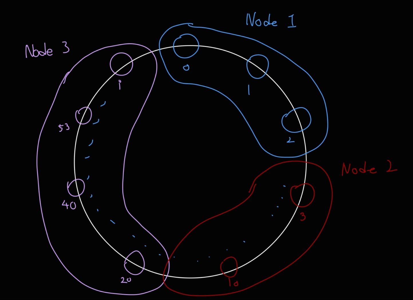 예를 들어 그 서버의 IP 주소와 같은 값을 해싱했다고 해보자. 첫번째 서버의 해시 결과가 2, 두번째 서버의 해시 결과가 19, 세번째 해시 결과가 i 라면 0부터 2까지는 파란색 노드(서버)가 담당하고, 3 ~ 19 는 빨간색 노드, 20 ~ i 까지는 보라색 노드가 담당하도록 설정할 수 있다. (만약 서버가 1개라면 1개의 서버가 0 ~ i 범위를 모두 커버할 것이다.)