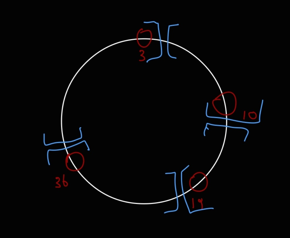 그리고 각 서버가 담당하는 역할은 자신의 해시값에서부터 시계 반대방향으로 돌면서 그 영역의 해시값에 대해서 자신이 관리하는 것이다.