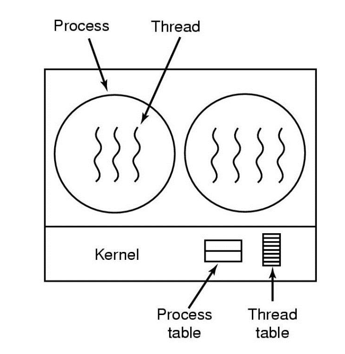 이때 운영체제는 실제로 멀티스레드가 가능한 환경으로 동작하지만, 커널은 스레드의 존재를 모르고, 기존의 프로세스 모델에서 프로세스를 다루는 것과 비슷하게 돌아간다. 따라서 커널에는 process table 이 존재한다.