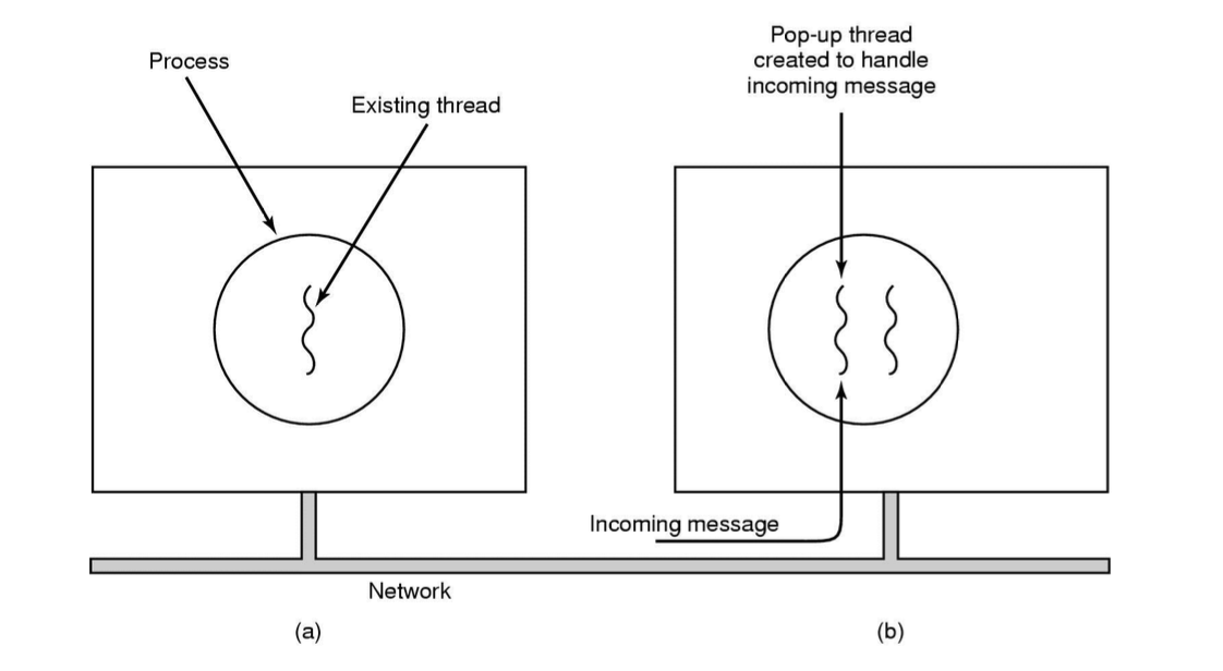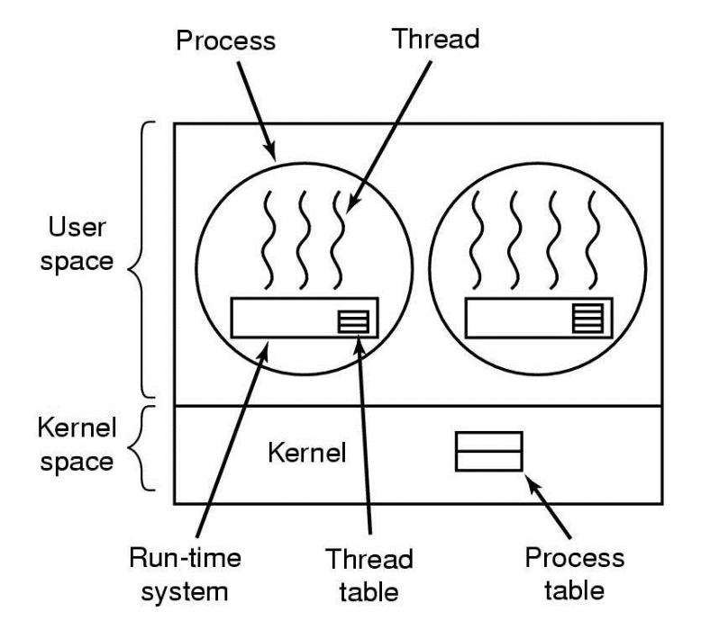 또한 런타임 시스템이 스레드를 관리하다보니 각 스레드의 상태를 저장하는 (스택, 프로그램카운터, state, 레지스터) 스레드 테이블을 추가적으로 프로세스 내부에 가지게 된다.