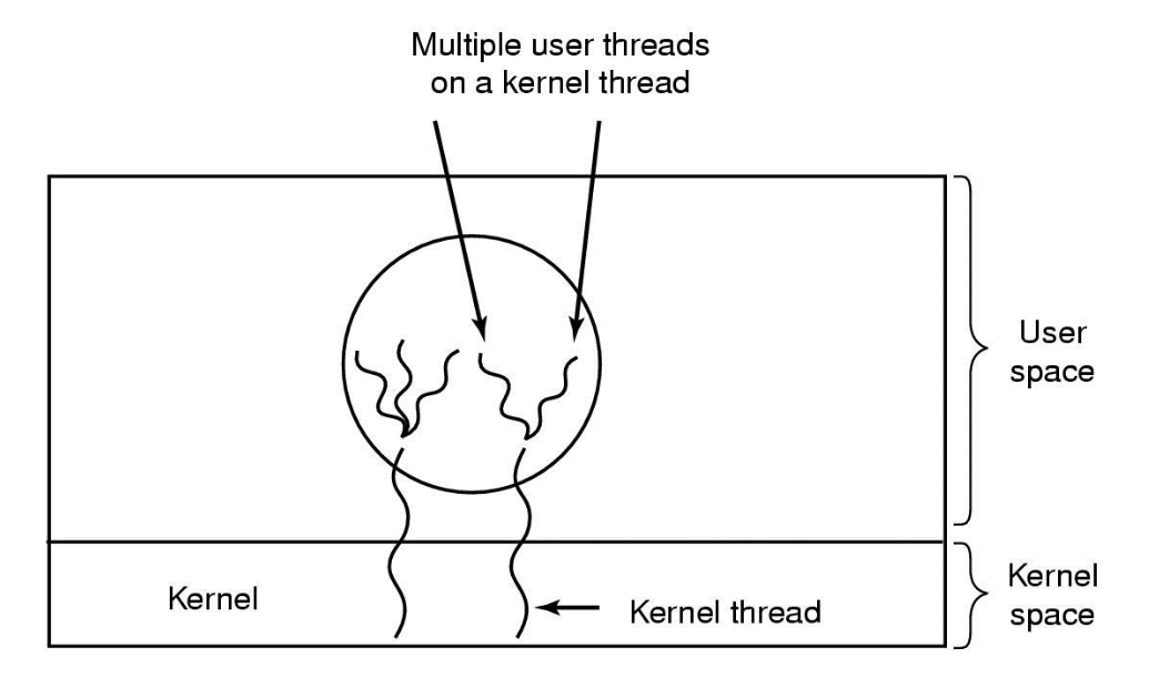 하이브리드 방식은 하나의 프로세스에 존재하는 스레드들에 대해서 커널 레벨에서 돌아가는 스레드가 있을 때, 이것과 별개로 유저 스페이스에서만 돌아가도 괜찮은 스레드를 동시에 같이 돌리는 방법이다.