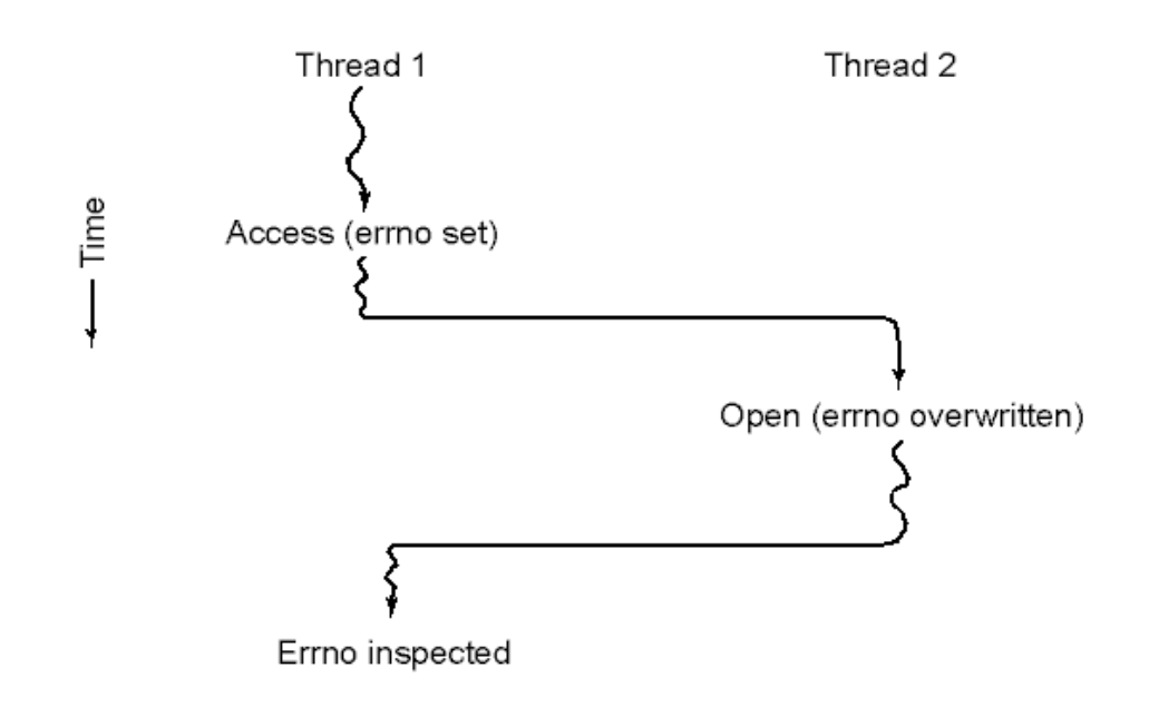 만약 이때 스레드 스위칭이 발생해서 스레드 2가 open 이라는 시스템 콜을 호출했다고 하면 이 시스템콜에 의해 errno 라는 전역 변수값이 덮어써질 수 있다. (이 전역 변수는 address space 에 존재하여 스레드들에게 공유되는 변수이다.)