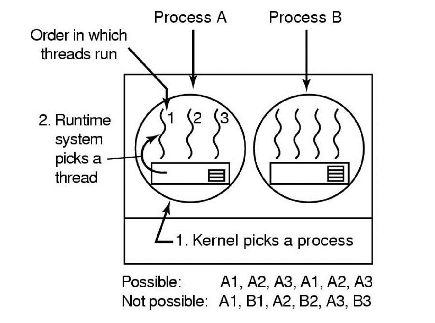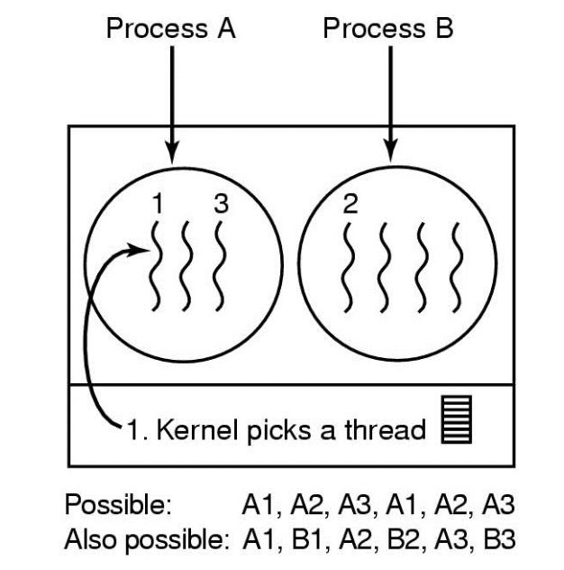 그러면 커널이 먼저 실행할 프로세스를 고르고, 그 다음에 런타임 시스템이 실행할 스레드를 골라서 굴리므로 프로세스 A의 스레드들이 A1 A2 A3 A1 A2 A3 이런식으로 돌아간다.