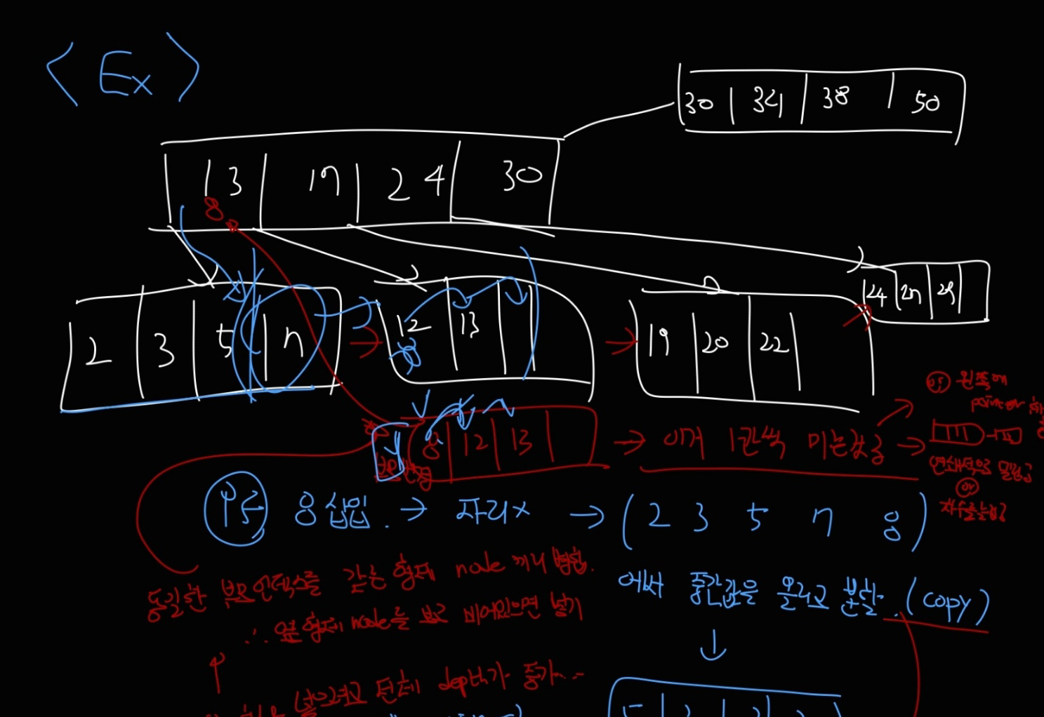 따라서 8이 삽입 되었을 때 7에 공간이 없다면 그 옆 <12, 13> 라인에 붙여서 <8, 12, 13> 으로 만든다.