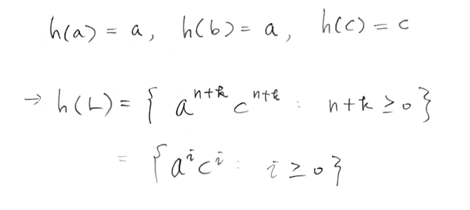 만약 어떤 homomorphism 을 위와 같이 정의한다고 하면, 주어진 언어 L 을 aⁱcⁱ 형태로 나타낼 수 있다.