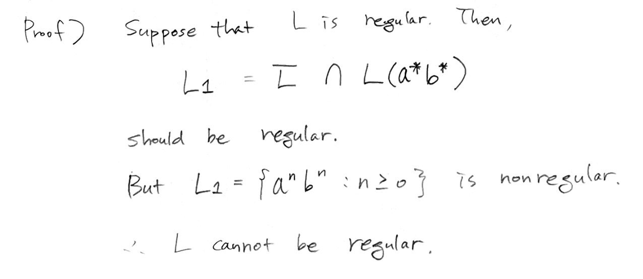 이 여집합 연산의 결과 역시 regular 하며, 이 결과에 대해 a가 선행하고 b가 후행하도록 제한을 걸은 L(a*b*) 언어를 교집합 연산을 취해준다. 이 언어는 regular 하므로 교집합 연산의 결과 역시 regular 하다.