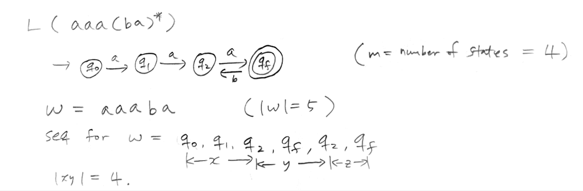 이 중에서 cycle이 발생하는 경우는 q2-qf-q2 이며 이 부분을 y로 묶은 뒤 앞 뒤를 x, z 로 만든다.