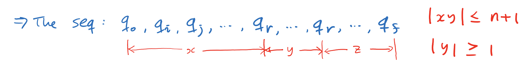 그러면 이 문장을 판별하는데 n+2 번이 상태를 거쳐갔으니 비둘기집 원리에 의해 적어도 한번의 상태는 중복 방문하였음을 알 수 있다.