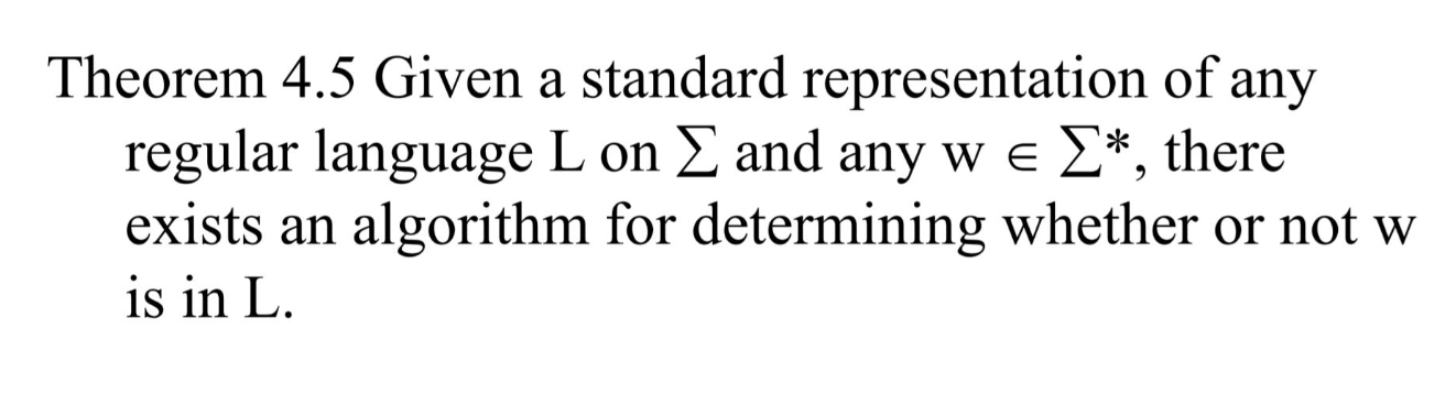 어떤 regular language 에 임의의 문자열을 넣었을 때, 그 문장이 L에 포함되는지 안되는지 결정할 수 있는 알고리즘이 존재한다.
