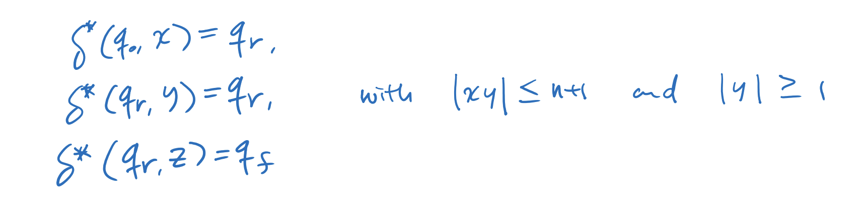 왜냐하면 y 는 pumping up, down 이 가능해야하는데, 이 seq 에서 사이클은 q0 - q0 로 가는 state 밖에 없기 때문이다. 이 구간을 정해두고 나면 나머지 앞 뒤가 x, z 가 된다.