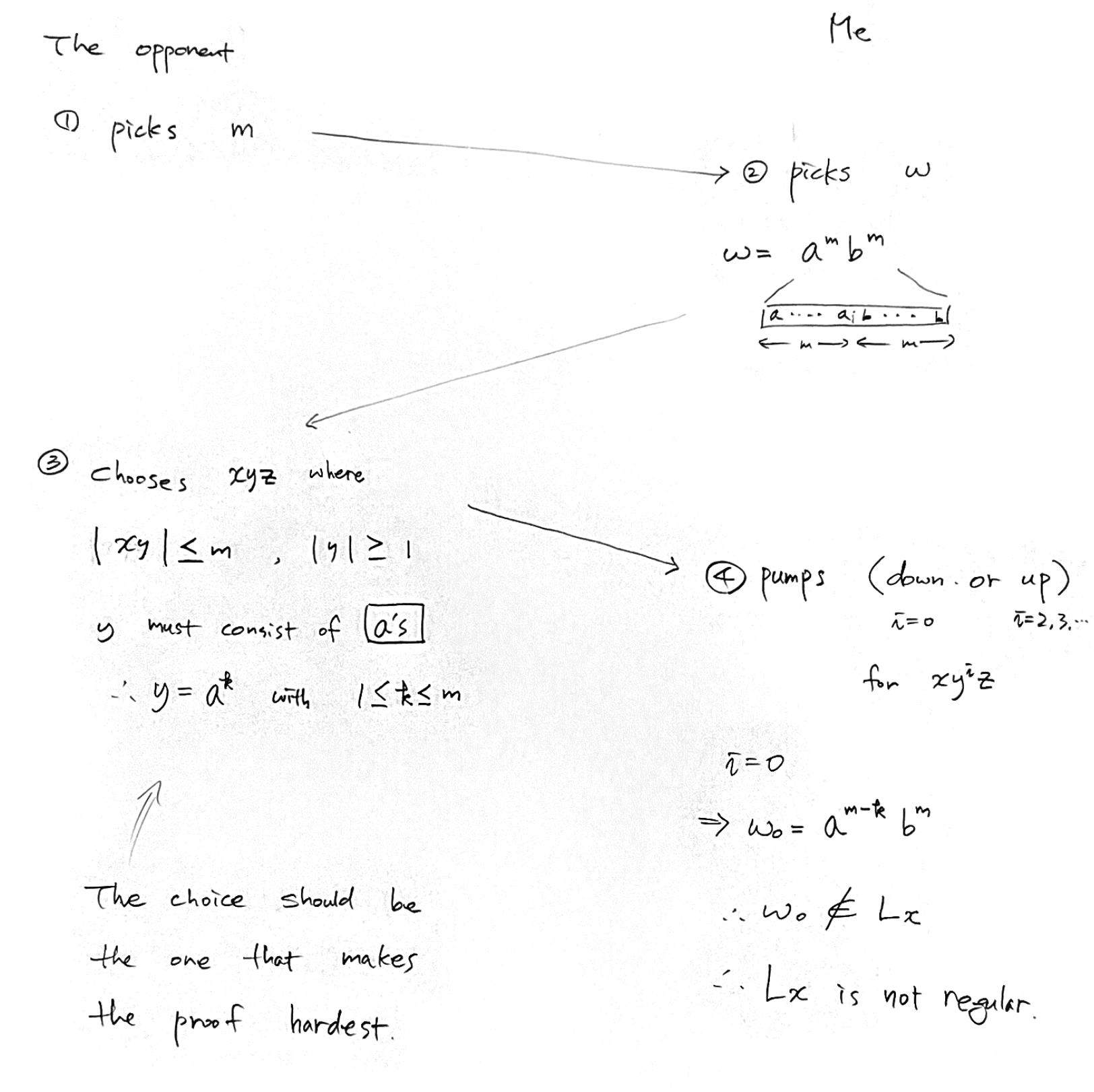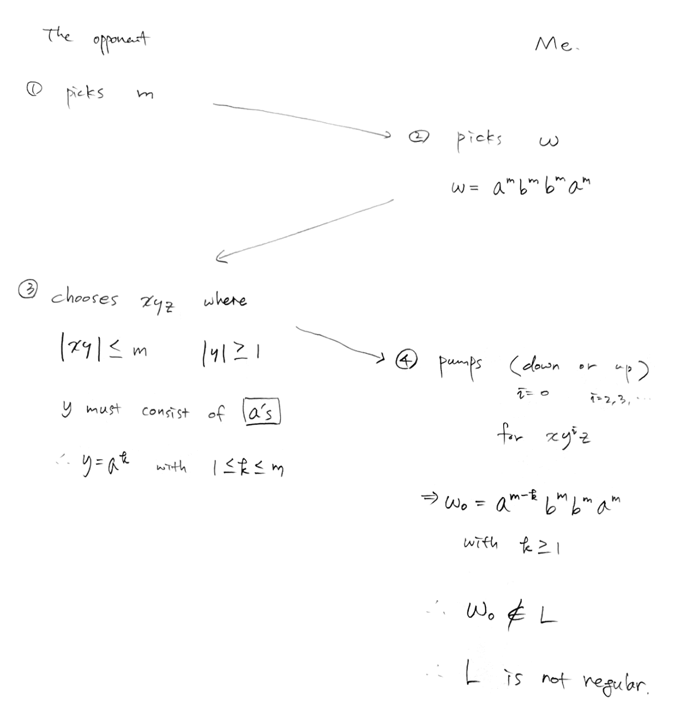 4. 상대방이 쪼갠 xyz에 대해 y를 자유롭게 늘리고 줄이면서 L에 속하지 않는 문장을 찾는다.