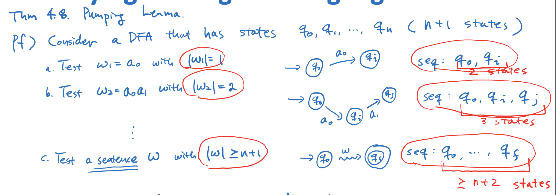 그러면 이 문장을 판별하는데 n+2 번이 상태를 거쳐갔으니 비둘기집 원리에 의해 적어도 한번의 상태는 중복 방문하였음을 알 수 있다.