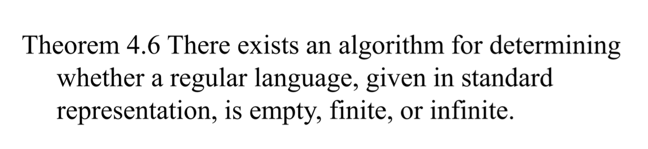 standard representation 으로 나타낸 regular language 에 대해서, 이 언어 집합이 공집합, 유한집합, 무한집합 중 어떤 것에 해당하는지 판별하는 알고리즘이 존재한다.