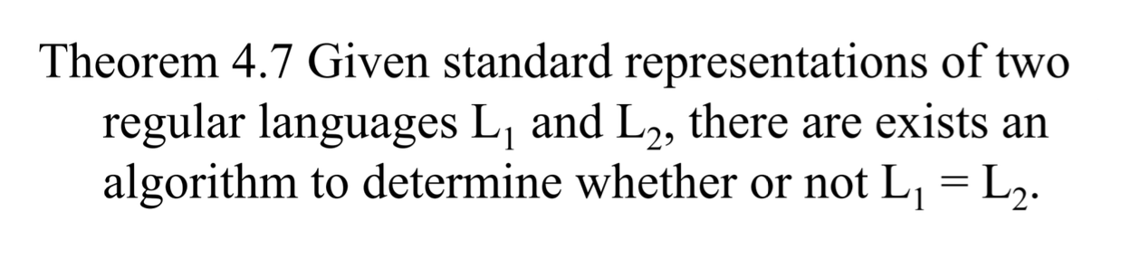 두 regular language L1, L2 가 주어졌을 때, 두 언어가 같은지 판별할 수 잇는 알고리즘이 존재한다.